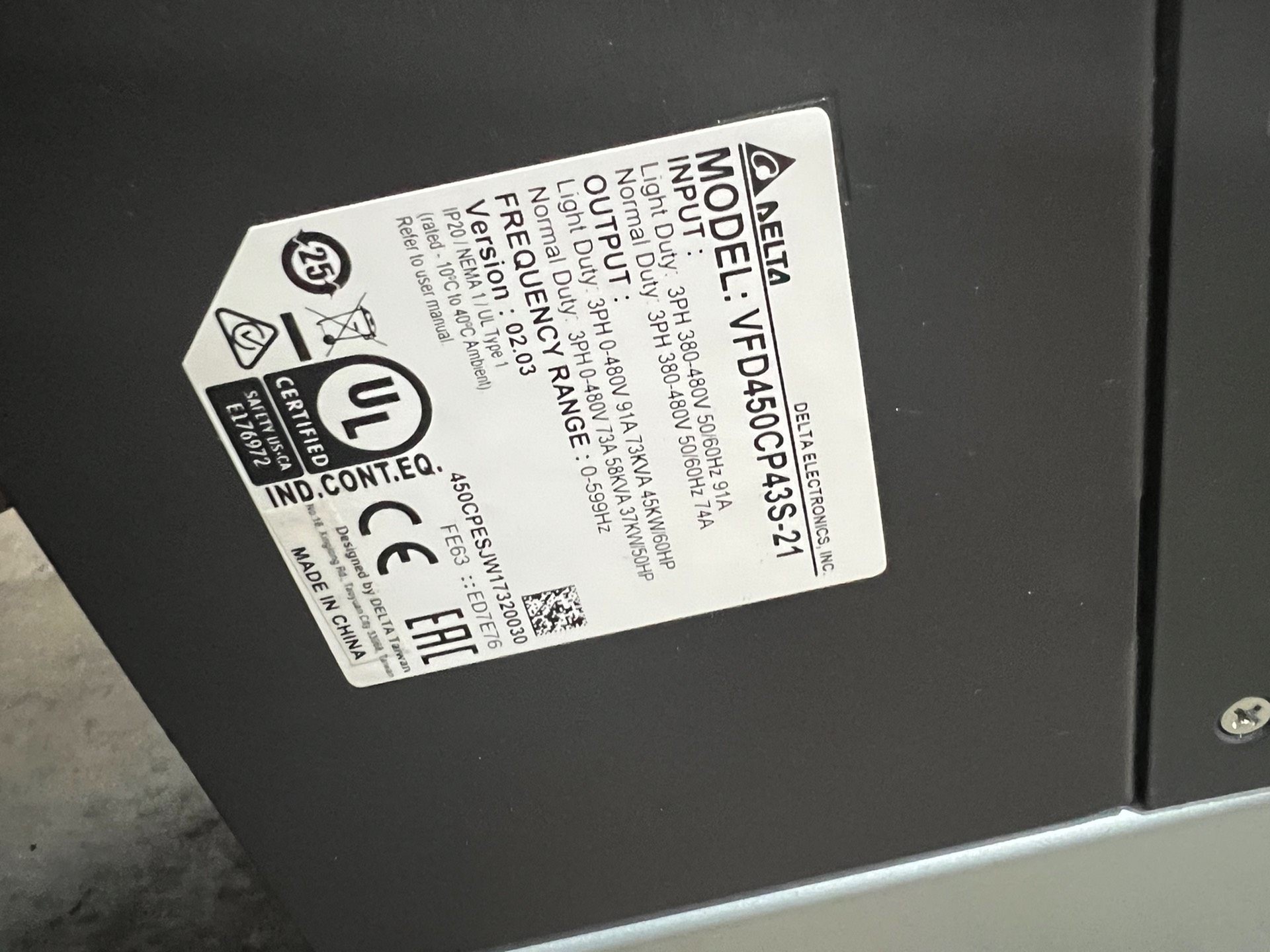 > 台达CP2000变频器45KW,实物拍摄,9成新,功能完好没