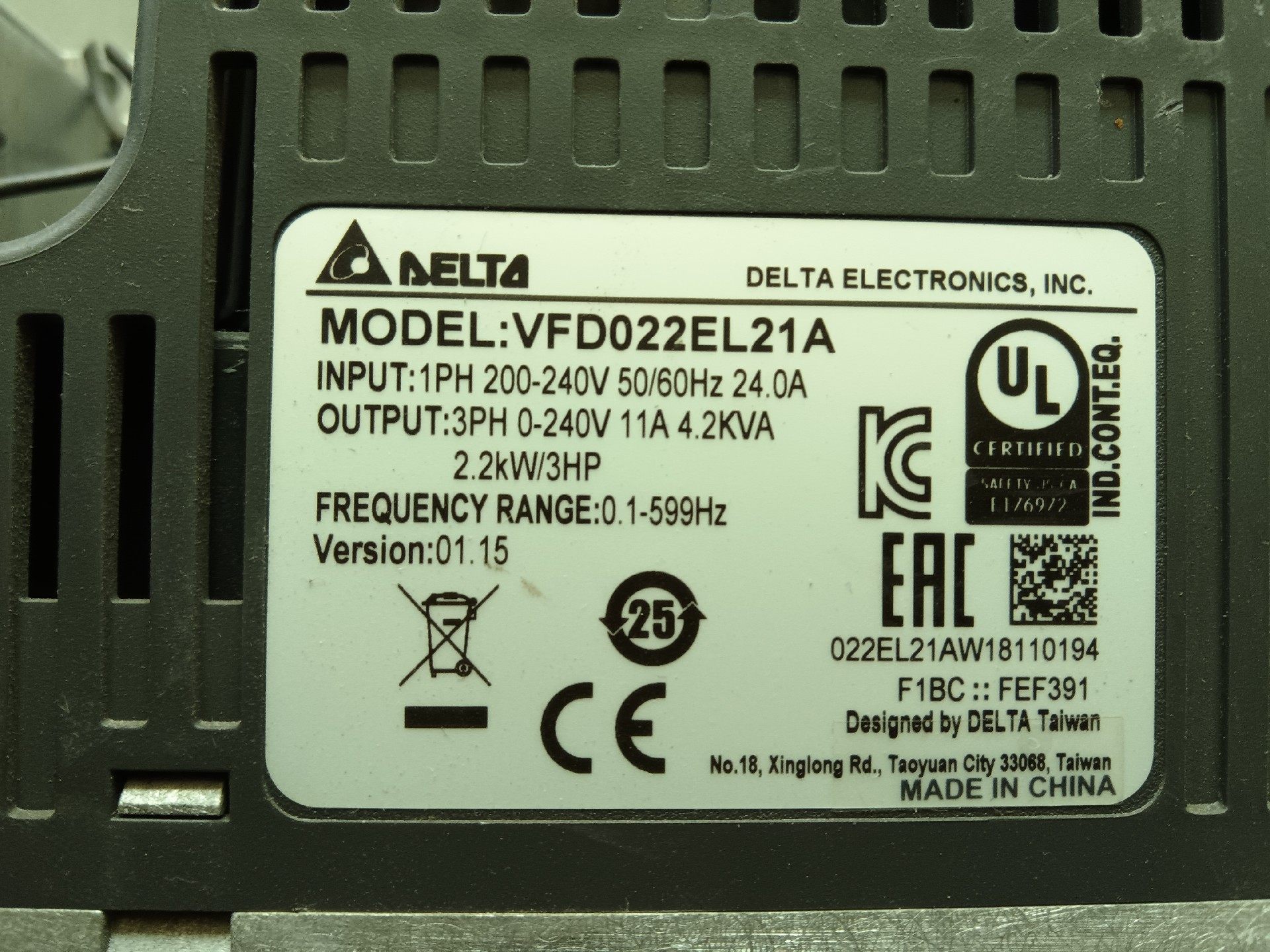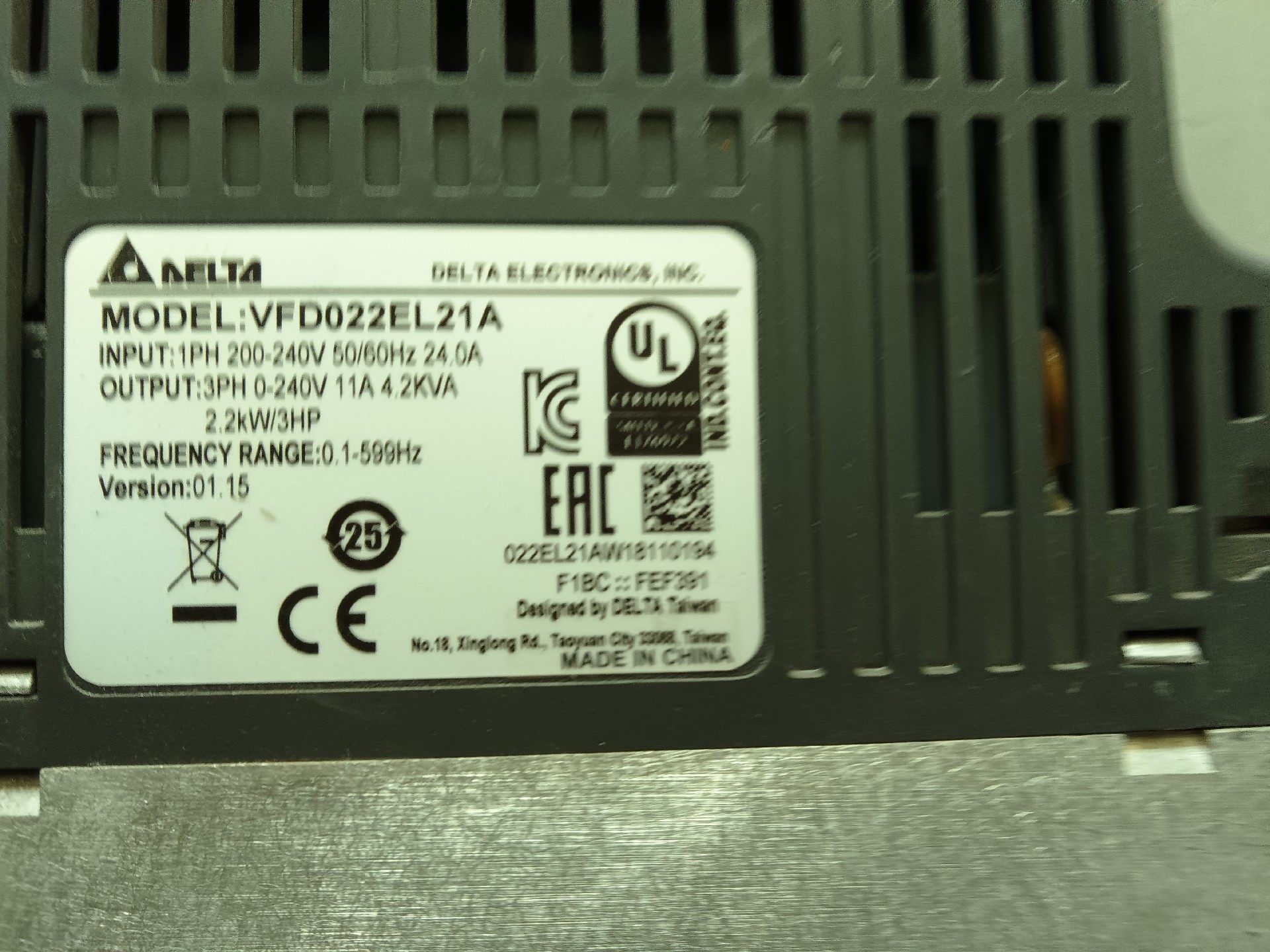 > 台达VFD022EL21A变频器 2.2kw 220v