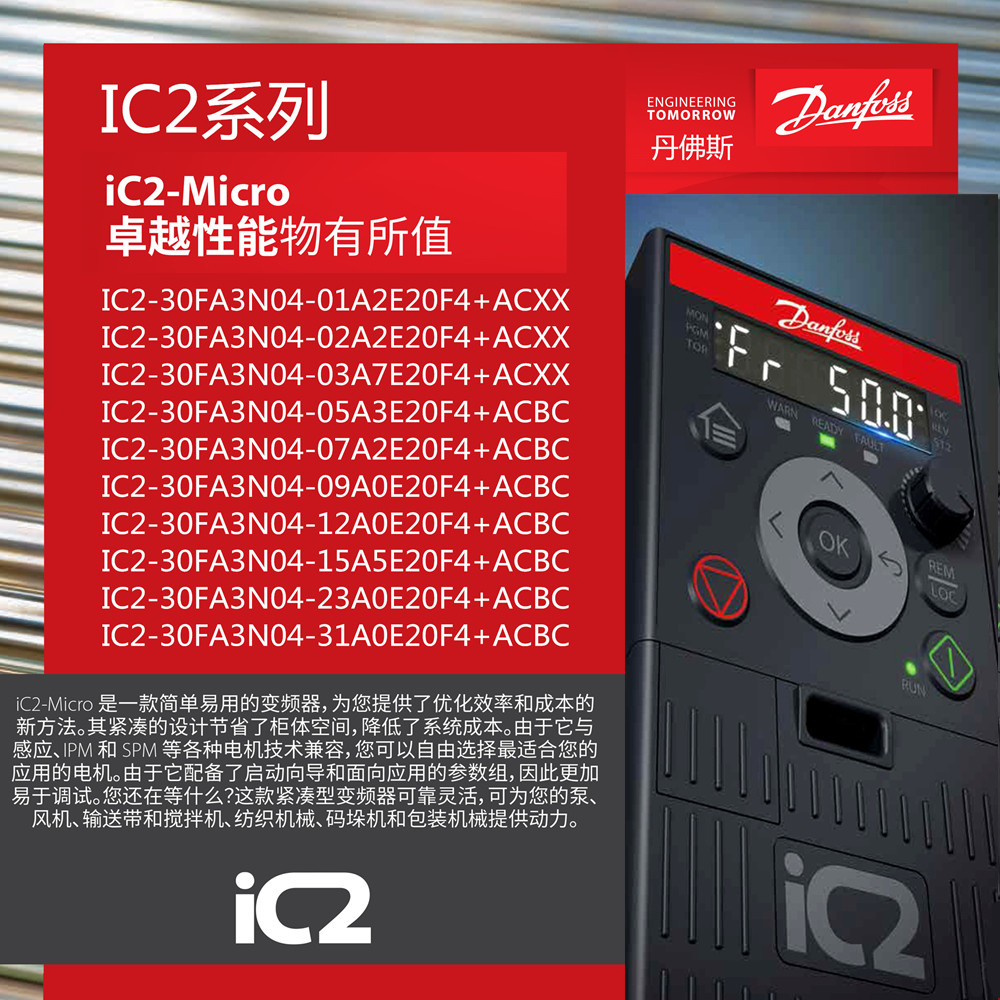 丹佛斯IC2系列简易变频器水泵风机输送带纺织搅拌机用自带面板