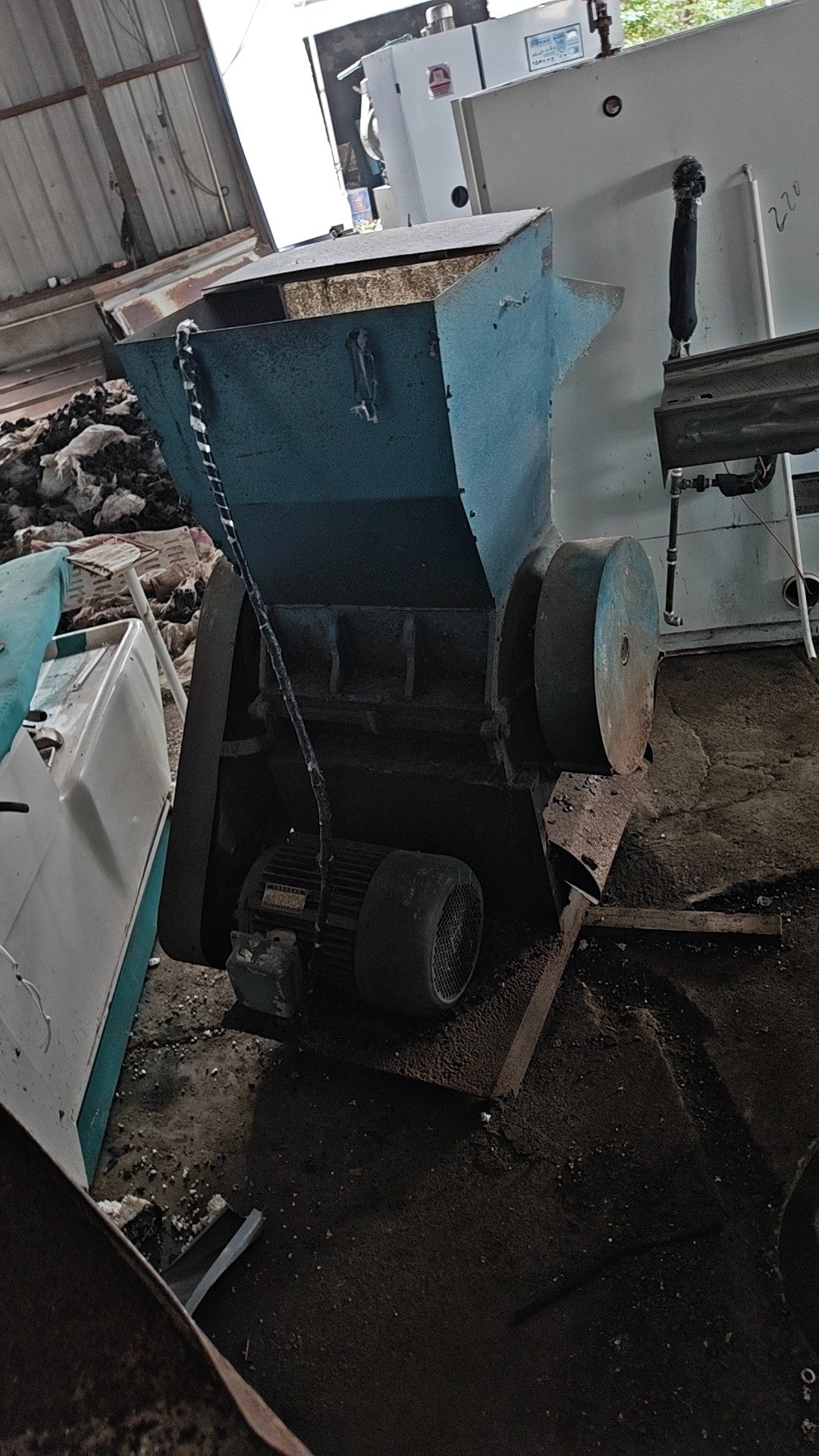 二手粉碎机,蓝色机身,带电机,机器成色正常,有使用痕迹。设备