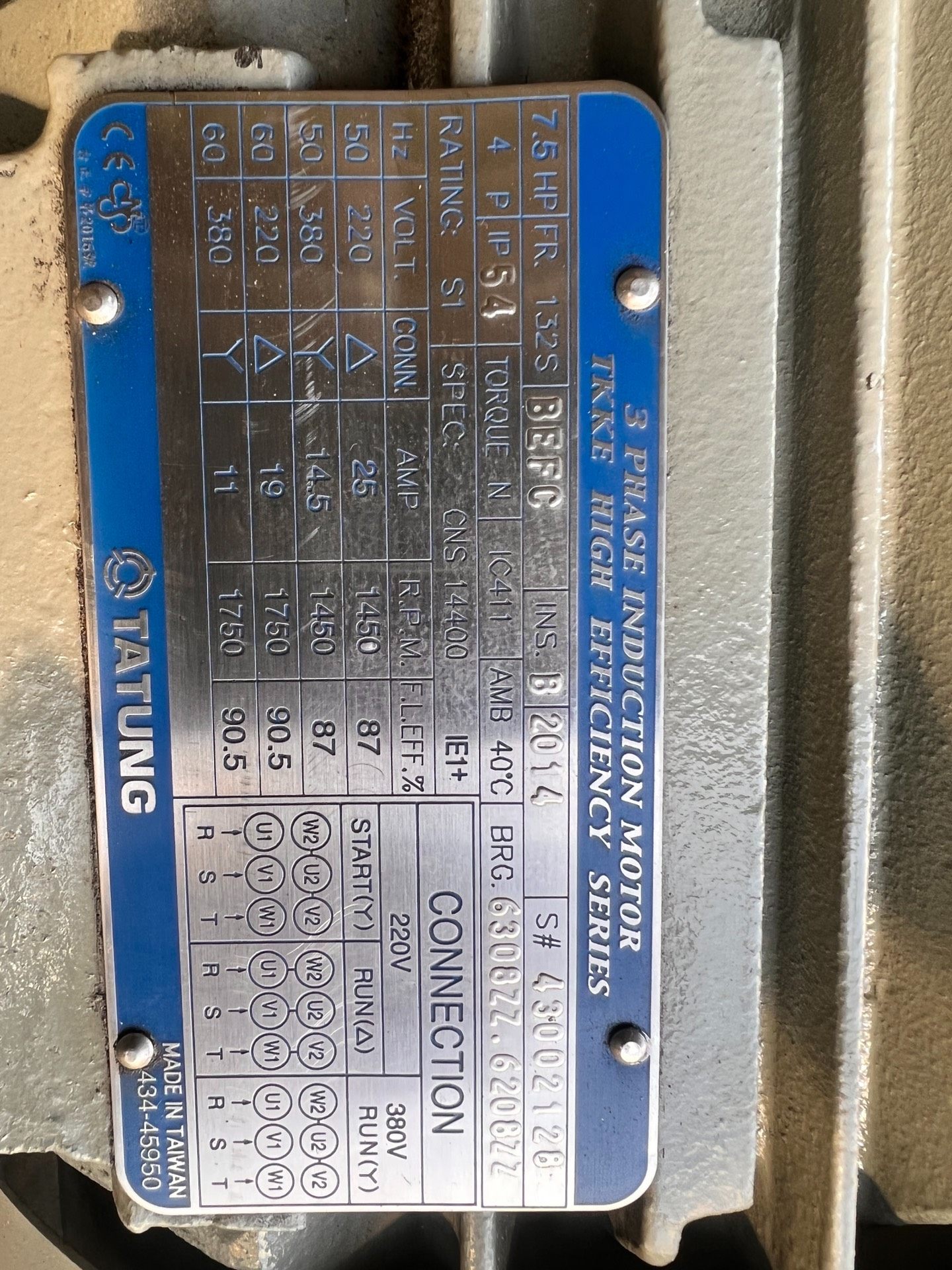 台湾大同电机,5.5千瓦,转速1450转,机子99新