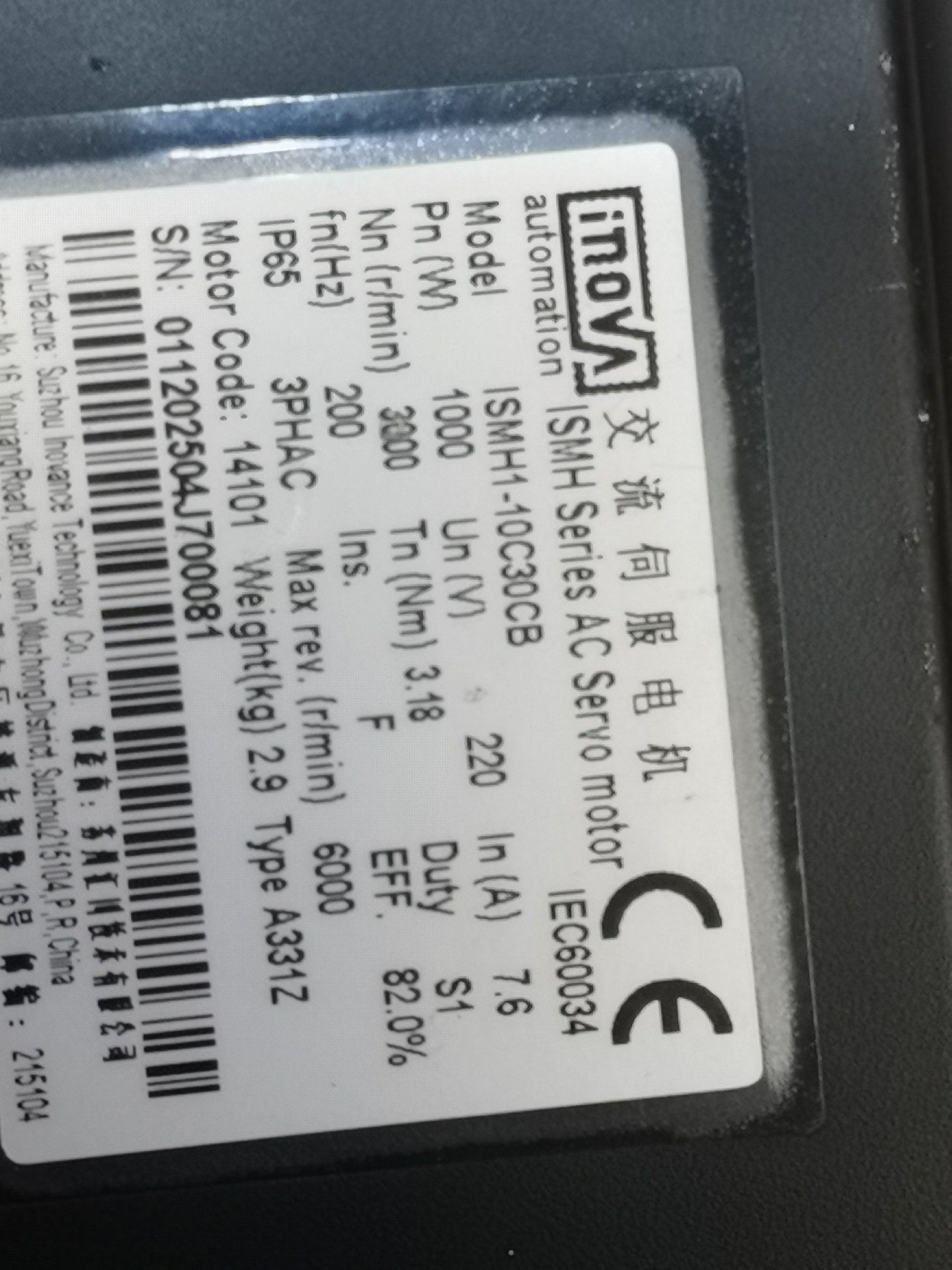 > 汇川伺服电机,ⅠSMH1-10C30CB,A331Z,拆机件