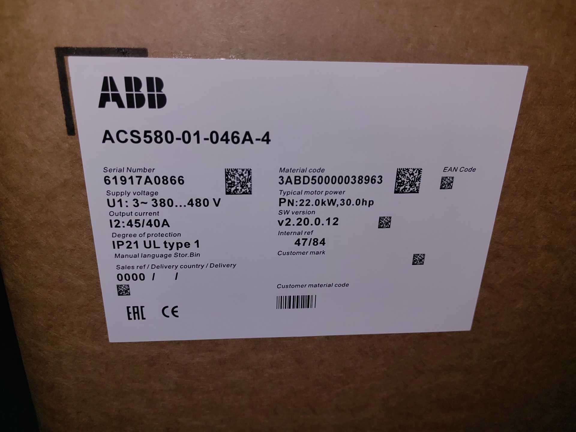 ABB变频器ACS580-01-046A-4,22kw大功率