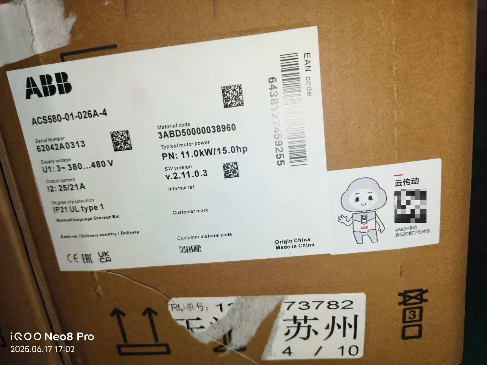 > ABB变频器ACS580-01-026A-4,11kW功率,