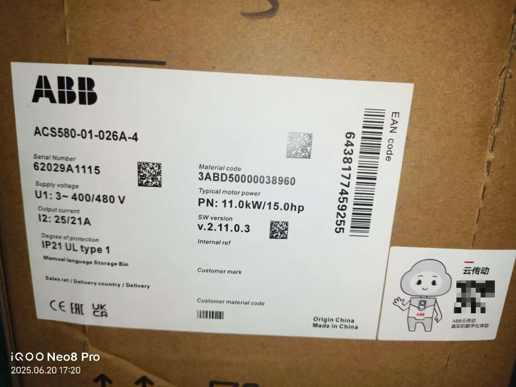 > ABB变频器ACS580-01-026A-4,11kW功率,
