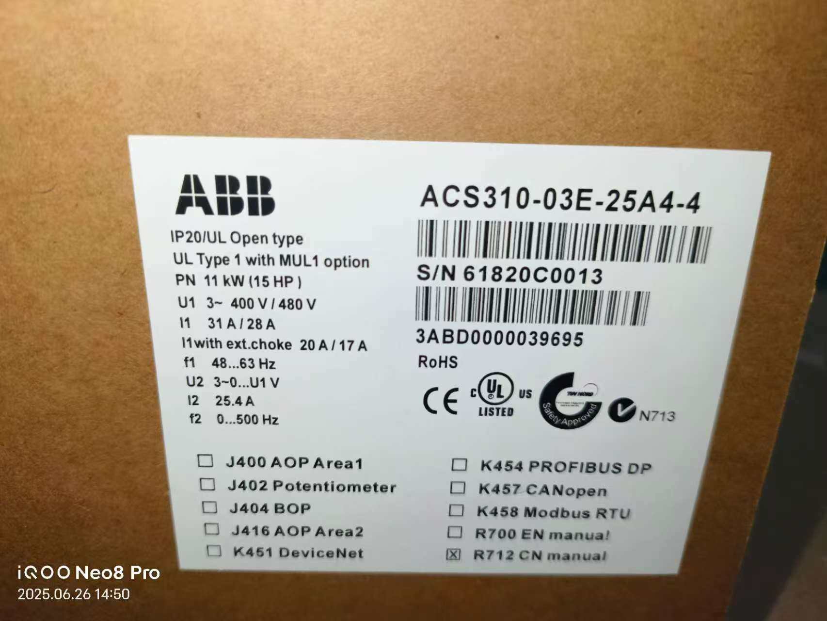 ABB变频器ACS310-03E-25A4-4,11KW功率
