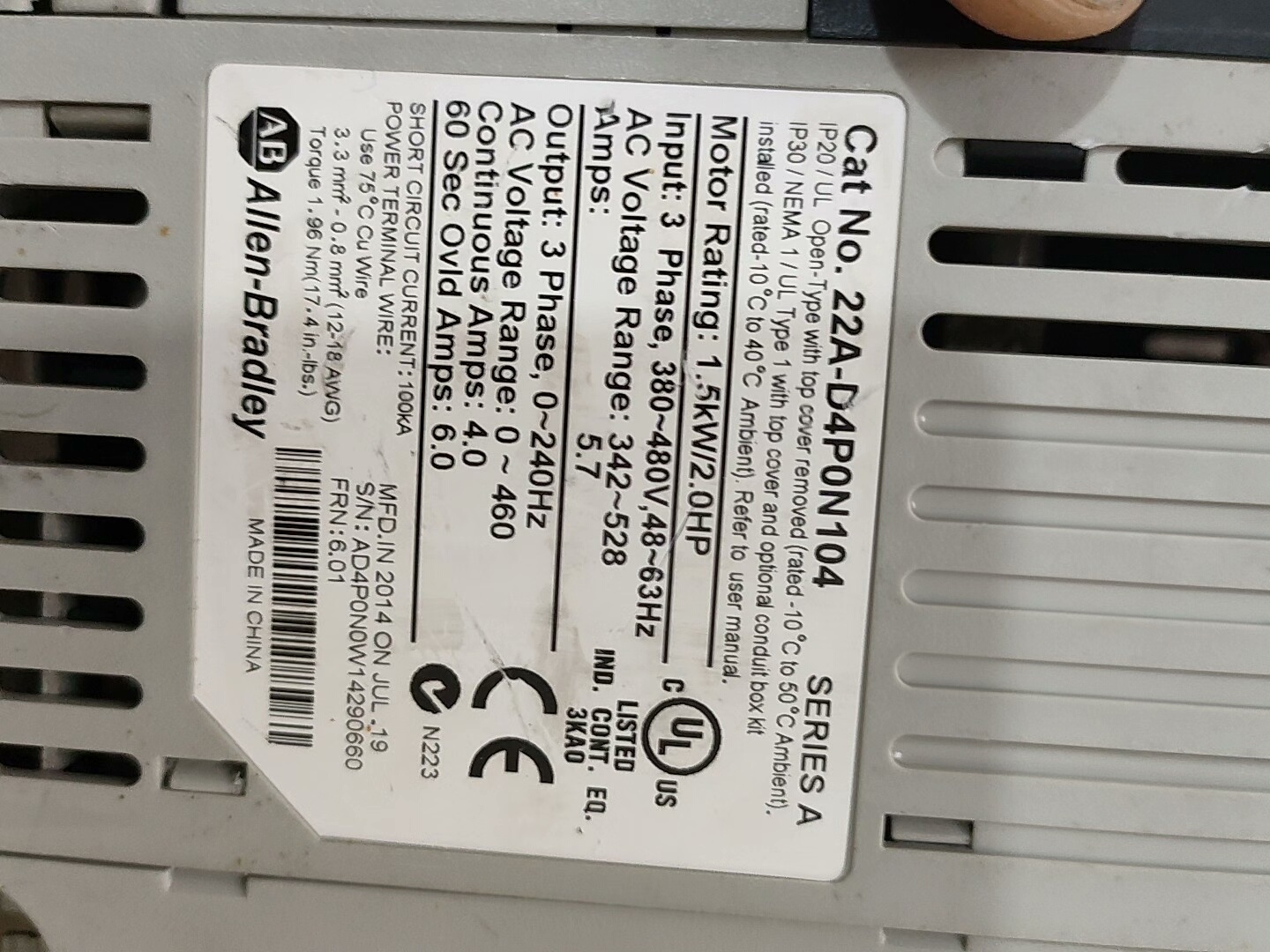 > AB变频器,型号22A-D4P0N104,1.5KW/380