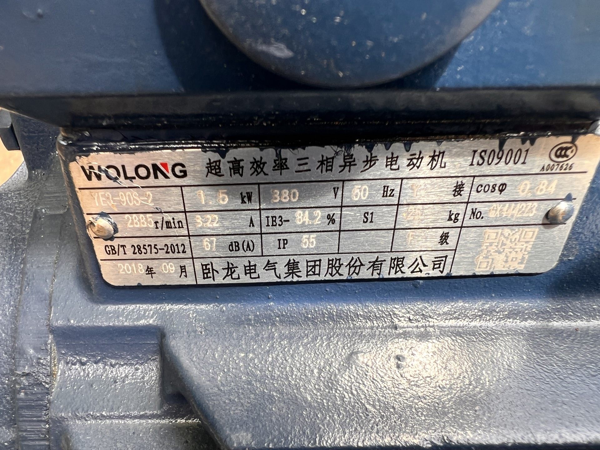 卧龙电机,YE3节能电机,二级能效,1.5千瓦,转速2885