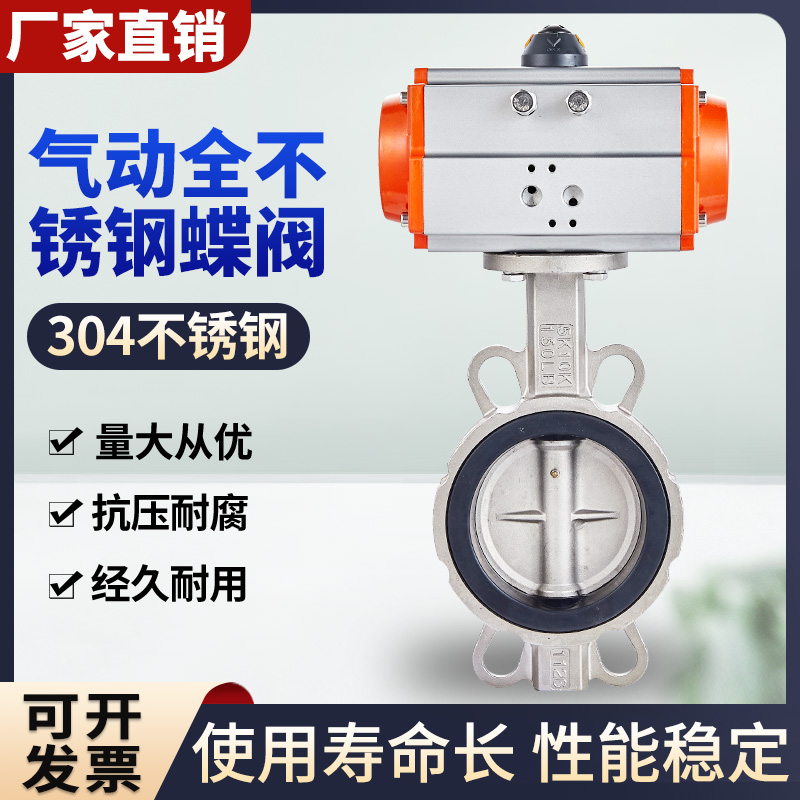 气动蝶阀D671F-16P对夹式全不锈钢四氟耐酸碱快开阀门乙丙胶密封
